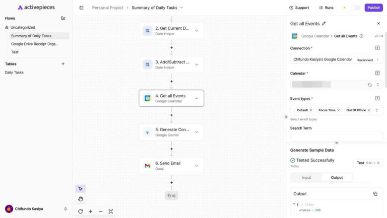 - دریافت رویدادها: از اکشن Google Calendar: Get All Events استفاده کردم. اتصال به اکانت گوگل در Activepieces بسیار روانتر از n8n انجام شد. ورودیها را از مراحل قبل (تاریخ شروع و پایان) گرفتم.