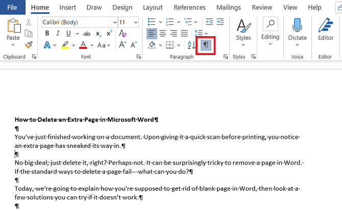 در فرآیند حذف یک صفحه خالی در آخر ورد شما باید زبانه Home را انتخاب کرده و سپس از طریق منو Paragraph گزینه که امکان مدیریت نمایش یا عدم نمایش کاراکترهای غیرچاپی فراهم می کند را انتخاب نمایید.