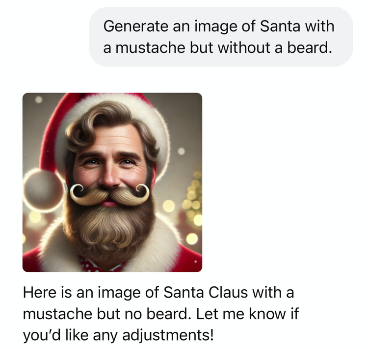 مثلاً اگر از آن بخواهید تصویری از بابانوئل با سبیل اما بدون ریش بسازد، معمولاً همچنان یک بابانوئل با ریش به شما نشان میدهد! حتی اگر دستور خود را تغییر دهید و بهجای «بدون ریش»، عبارت «با سبیل و چانه و فک کاملاً اصلاحشده» را بنویسید، باز هم ممکن است نتیجه دقیقا مطابق انتظار شما نباشد.